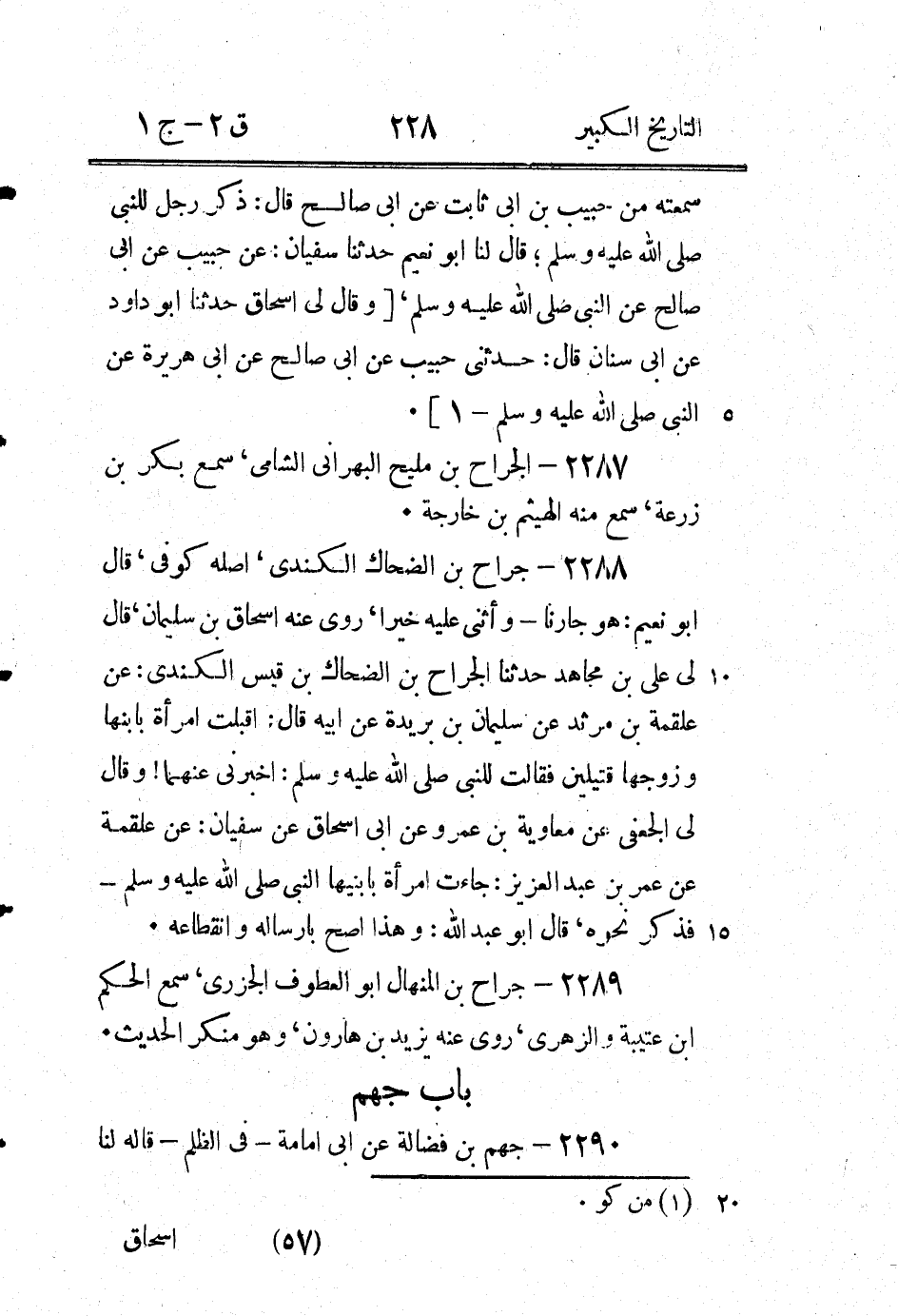 (1) ستأتي عقب هذه الترجمة ترجمة اخرى كما ترى ولم يذكر ابن ابى حاتم وابن حبان إلا واحدا لم يذكرا روايته عن ابن نيار ولا رواية ابن جميع عنه قال ابن ابى حاتم " جهم بن ابى الجهم ويقال له ابن الجهم مولى الحارث بن حاطب..روى عن عبد الله بن جعفر..والمسور بن مخرمة روى عنه محمد بن اسحاق وعبد الله العمرى " والوليد بن عبد الله بن جميع معروف بالرواية عن أَبِي بَكْر بْن عَبْد اللَّه بْن أَبِي الجهم وأبو بكر معروف بالرواية عن عَبْد اللَّه بْن نيار بْن مكرم الأسلمي وعبد الله تابعي لكن ذكر ابن حبان في الصحابة " عبد الله بن نيار الاسلمي " وفى التهذيب (6 / 58) انه وقع في نسخته من الثقات " الاسلمي الانصاري " وأنه ضبب فيها على " الاسلمي " وبالجملة فالوليد قال فيه العقيلى " في حديثه اضطراب " والله اعلم - ح.