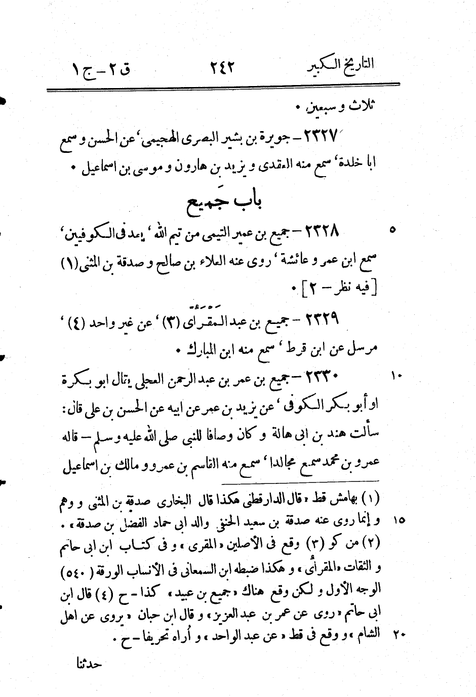 (1) لم يذكره ابن ابى حاتم في هذا الباب بل ذكره في باب الواجد وضبطه عبد الغنى في المؤتلف ص 26 بفتح الجيم ثم قال " ويقال جميع والصواب بالفتح " وقال ابن ماكولا " اما جميع بفتح الجيم وكسر الميم فهو جميع بن ثوب حمصي كذا يقول اهل بلده..وذكره البخاري بضم الجيم " - ح.