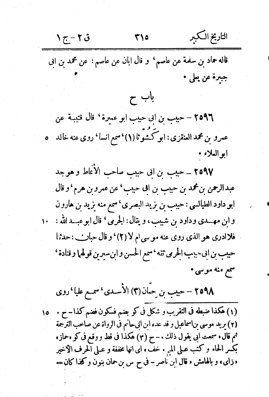 وذكر ابن ماكولا انه اختلف فيه ويؤخذ من عبارته ان وكيعا ويزيد بن هارون قالا حبيب بالتشديد وأن موسى بن اسماعيل قاله بالتخفيف قال " وقال ابن المبارك حبيب أو حبيب " وفسره في التعجيل ص 85 قال " تردد هل هو بالتشديد أو كالجادة " - ح.