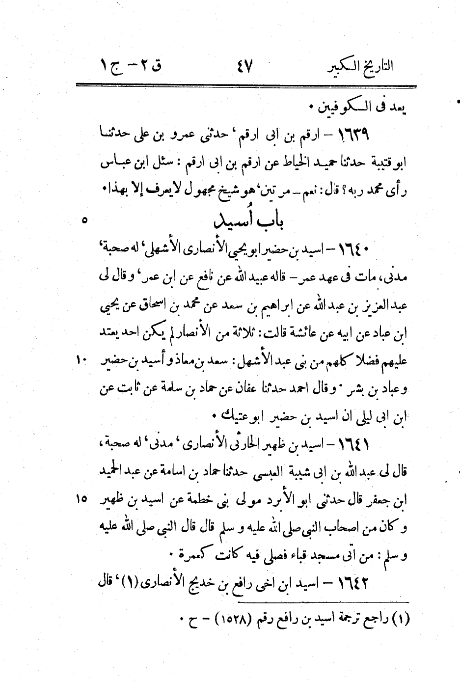 (1) هو ابن زياد يروى عن سعيد الزبيدى ويروى عنه موسى بن اسماعيل شيخ البخاري ووقع في قط " عبد الرحمن " كذا - ح (2) من كو (3) كذا ثبت هذا العنوان والترجمة في الاصلين وكأنه سهو فقد تقدم باب اسيد بالفتح وفيه هذه الترجمة رقم (1535) بلفظ " اسيد بن يزيد المدينى ... " - ح.