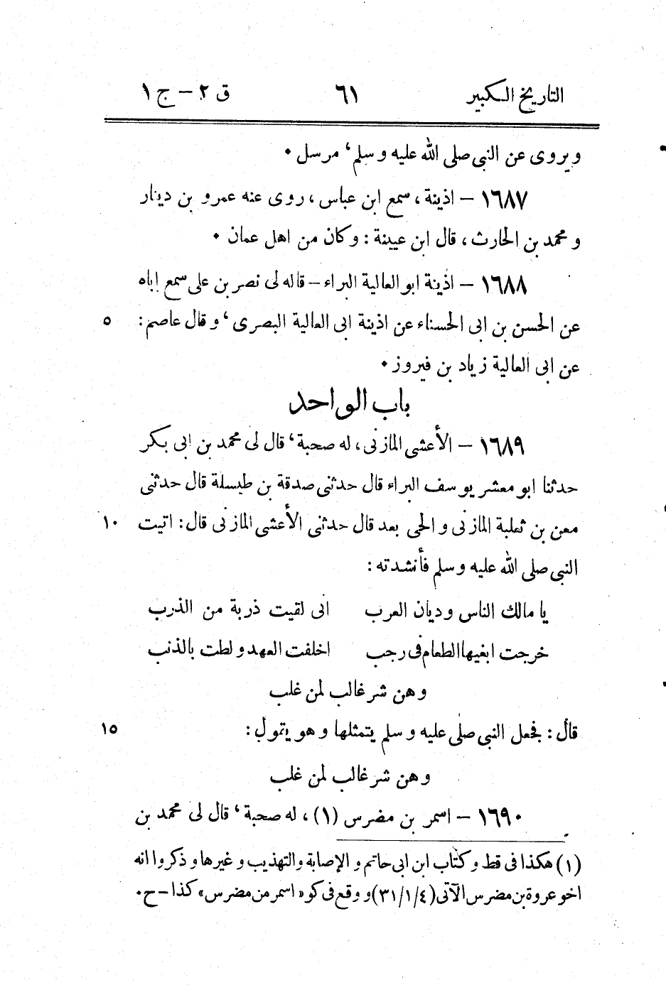 1691 - أحمر بْن جزي (4) السدوسي الربعي بصري، لَهُ صحبة، قَالَ لَنَا مُسْلِمُ بْنُ إِبْرَاهِيمَ قَالَ ثنا عَبَّادُ بْنُ رَاشِدٍ قَالَ حدثنا الحسن