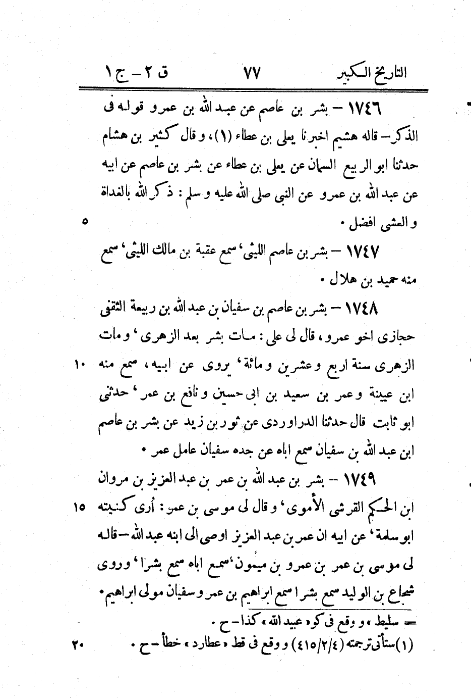 1752 - بشر بْن عائذ، يعد فِي الْبَصْرِيّين قَالَ لَنَا آدَمُ حَدَّثَنَا شُعْبَةُ قَالَ حَدَّثَنَا قَتَادَةُ حَدَّثَنِي بَكْرُ بْنُ عَبْدِ اللَّهِ وَبِشْرُ بْنُ الْمُحْتَفِزِ (4) عَنِ ابْنِ عُمَرَ عَنِ النَّبِيّ صَلَّى اللَّهُ عَلَيْهِ وَسَلَّمَ - فِي الْحَرِيرِ، قَالَ ابن مهدى