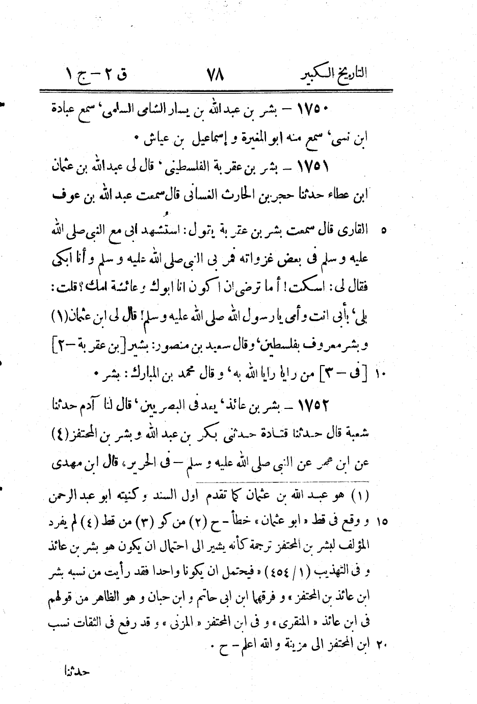 حَدَّثَنَا همام عَنْ قتادة عَنْ بكر وبشر (1) بْن عائذ عَنِ ابْن عُمَر عَنِ النَّبِيّ صَلَّى اللَّهُ عَلَيْهِ وَسَلَّمَ، وَقَالَ عَبْد الرَّحْمَن بْن المبارك حَدَّثَنَا الصعق عَنْ قتادة عَنْ علي البارقي عَنِ ابْن عُمَر عَنِ النَّبِيّ صَلَّى اللَّهُ عَلَيْهِ وَسَلَّمَ وَقَالَ عَبْد الواحد بْن غياث حَدَّثَنَا حماد بْن سلمة قَالَ أَخْبَرَنَا السكن بْن خَالِد عَنْ مجاهد: استعمل عُمَر بشر بْن المحتفز على السوس، ويقال: أن بشرا قديم الموت لا يشبه أن قتادة أدركه.