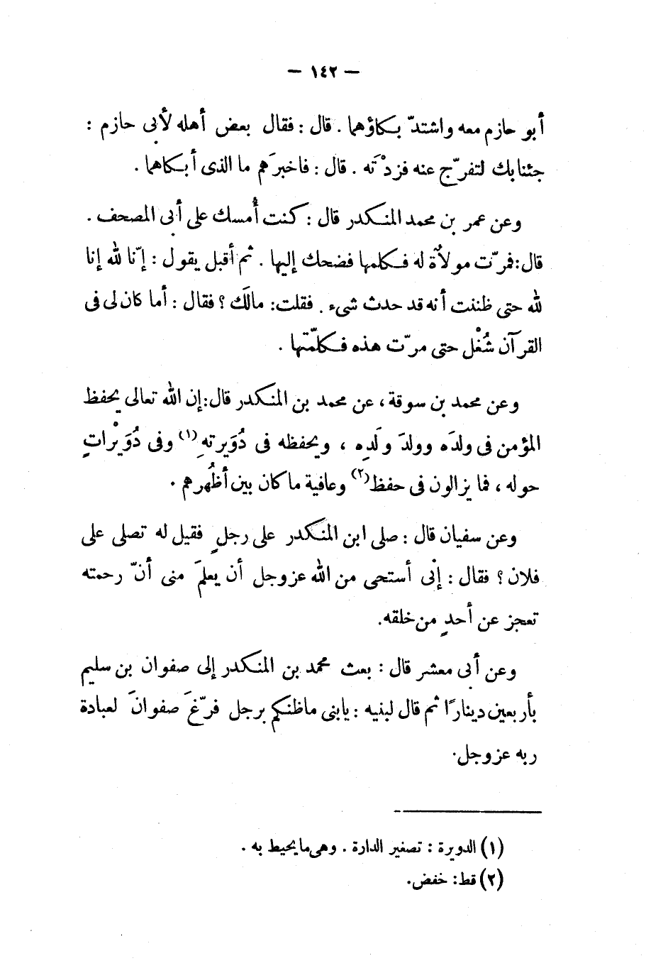وعن محمد بن سوقة عن محمد بن المنكدر قال إن الله تعالى يحفظ المؤمن في ولده وولد ولده ويحفظه في دويرته وفي دويرات حوله فما يزالون في حفظ وعافية ما كان بين أظهرهم
