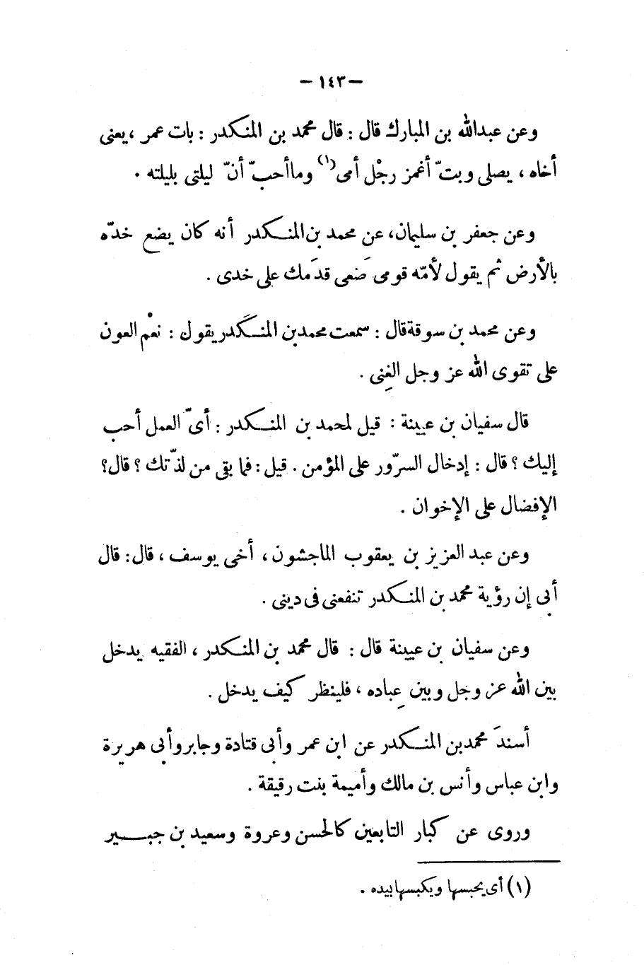 وعن عبد الله بن المبارك قال قال محمد بن المنكدر بات عمر يعني أخاه يصلي وبت أغمز رجل أمي وما أحب أن ليلتي بليلته