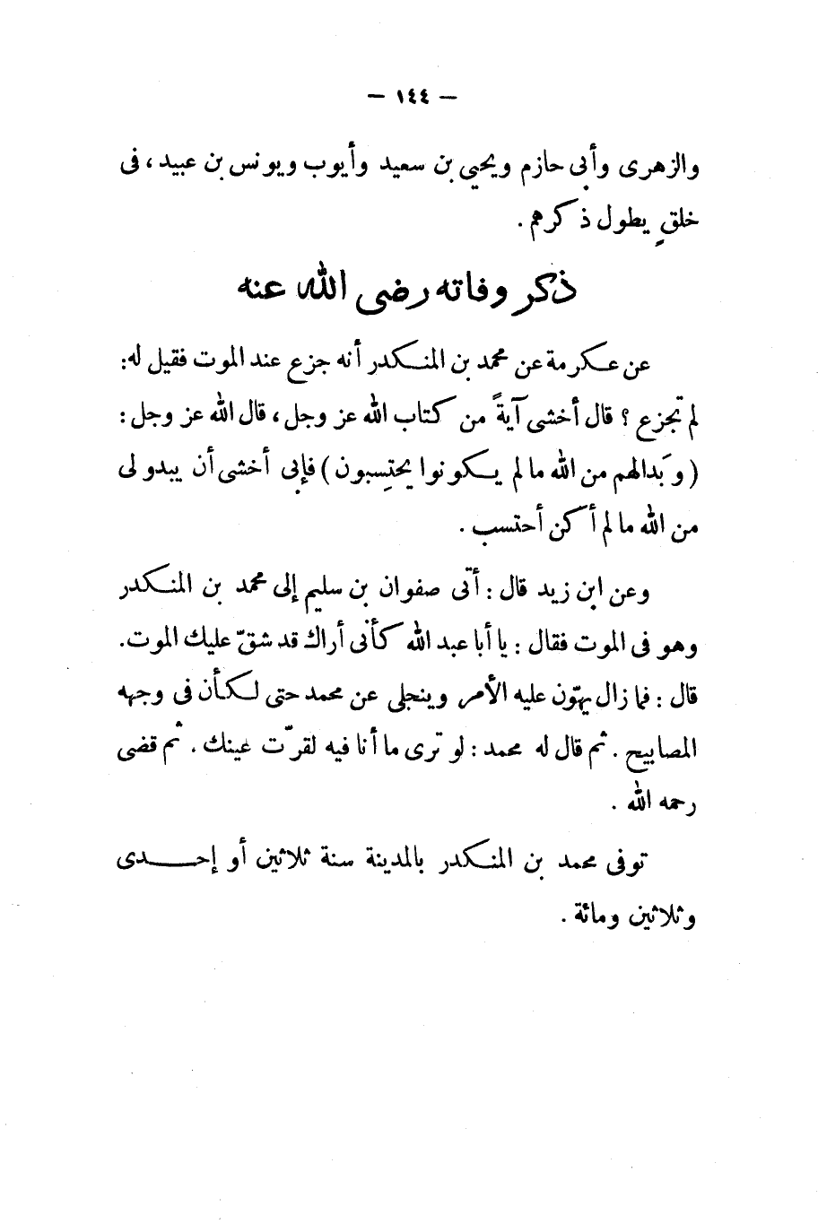 عن عكرمة عن محمد بن المنكدر أنه جزع عند الموت فقيل له لم تجزع قال أخشى آية من كتاب الله عز و جل قال الله عز و جل وبدالهم من الله مالم يكونوا يحتسبون فإني أخشى أن يبدو لي من الله مالم أكن أحتسب