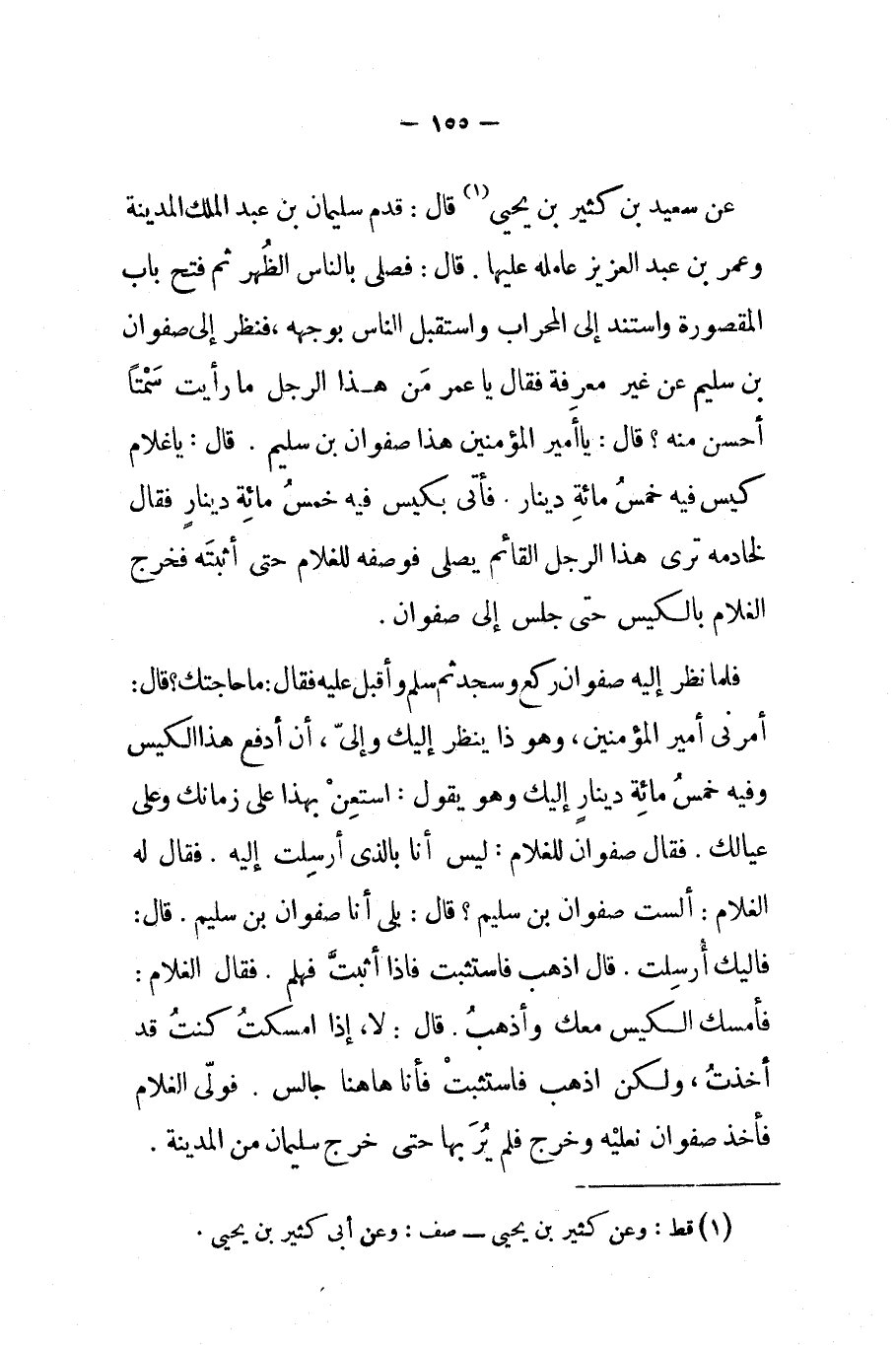 عن سعيد بن كثير بن يحيى قال قدم سليمان بن عبد الملك المدينة وعمر بن عبد العزيز عامله عليها قال فصلى بالناس الظهر ثم فتح باب المقصورة واستند إلى المحراب واستقبل الناس بوجهه فنظر إلى صفوان بن سليم عن غير معرفة فقال يا عمر من هذا الرجل ما رأيت سمتا أحسن منه قال يا أمير المؤمنين هذا صفوان بن سليم قال يا غلام كيس فيه خمس مائة دينار فأتى بكيس فيه خمس مائة دينار فقال لخادمه ترى هذا الرجل القائم يصلي فوصفه للغلام حتى أثبته فخرج الغلام بالكيس حتى جلس إلى صفوان