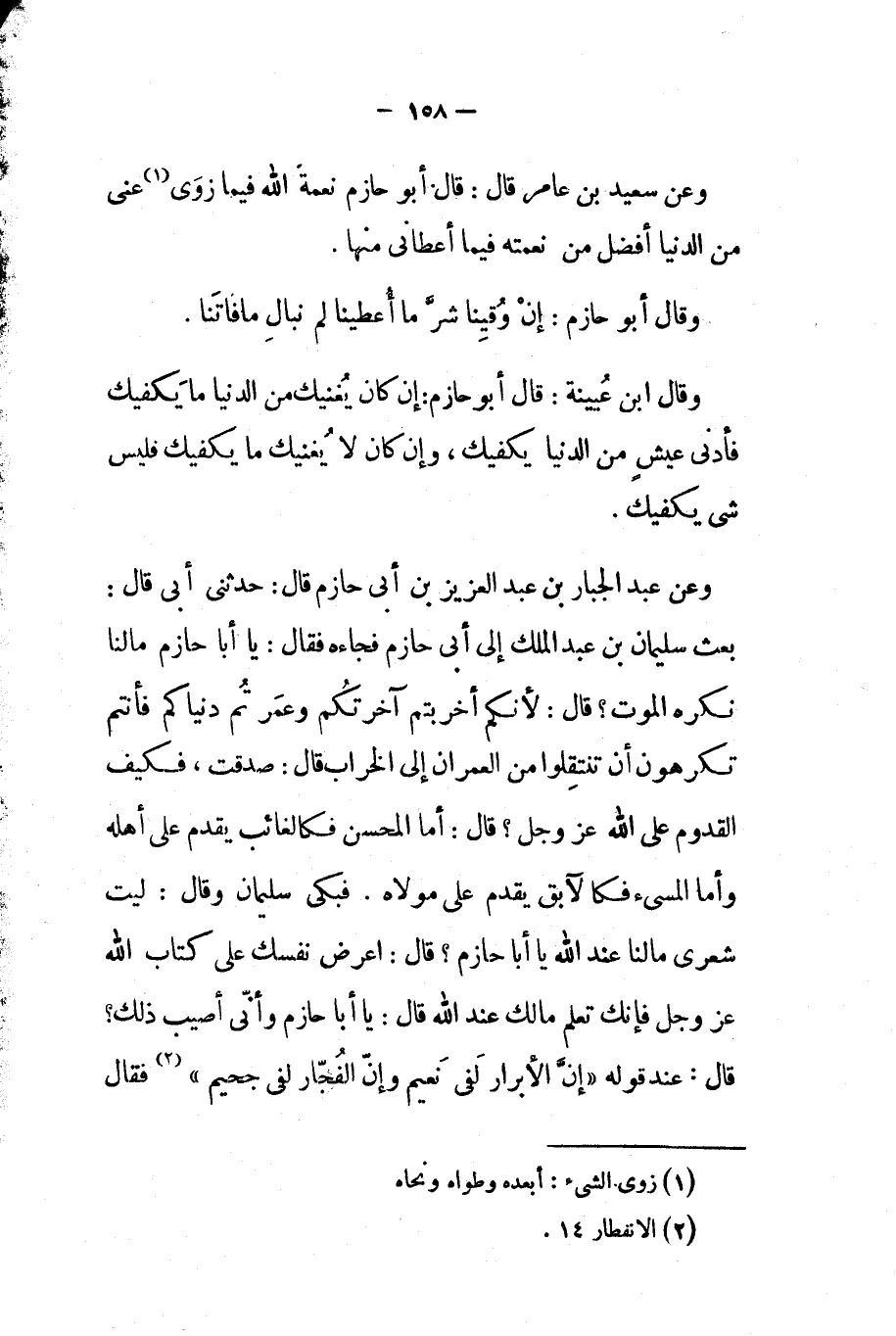 وعن عبد الجبار بن عبد العزيز بن أبي حازم قال حدثني أبي قال بعث سليمان بن عبد الملك إلى أبي حازم فجاءه فقال يا أبا حازم ما لنا نكره الموت قال لأنكم أخربتم آخرتكم وعمرتم دنياكم فأنتم تكرهون أن تنتقلوا من العمران إلى الخراب قال صدقت فكيف القدوم على الله عز و جل قال أما المحسن فكالغائب يقدم على أهله وأما المسيء فكالآبق يقدم على مولاه فبكى سليمان وقال ليت شعري ما لنا عند الله يا أبا حازم قال اعرض نفسك على كتاب الله عز و جل فإنك تعلم مالك عند الله قال يا أبا حازم وأنى أصيب ذلك قال عند قوله إن الأبرار لفي نعيم وإن الفجار لفي جحيم فقال