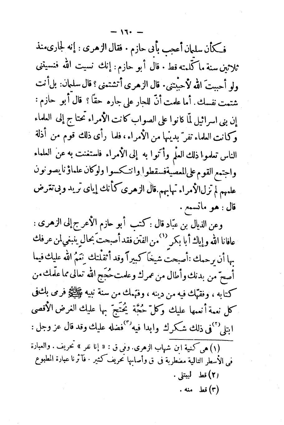 فكأن سليمان أعجب بأبي حازم فقال الزهري إنه لجاري منذ ثلاثين سنة ما كلمته قط قال أبو حازم إنك نسيت الله فنسيتني ولو أحببت الله لأحببتني قال الزهري أتشتمني قال سليمان بل أنت شتمت نفسك أما علمت أن للجار على جاره حقا قال أبو حازم إن بني اسرائيل لما كانوا على الصواب كانت الأمراء تحتاج إلى العلماء وكانت العلماء تفر بدينها من الأمراء فلما رأى ذلك قوم من أذلة الناس تعلموا ذلك العلم وأتوا به إلى الأمراء فاستغنت به عن العلماء واجتمع القوم على المعصية فسقطوا وانتكسوا ولو كان علماؤنا يصونون علمهم لم تزل الأمراء تهابهم قال الزهري كأنك إياي تريد وبي تعرض قال هو ما تسمع