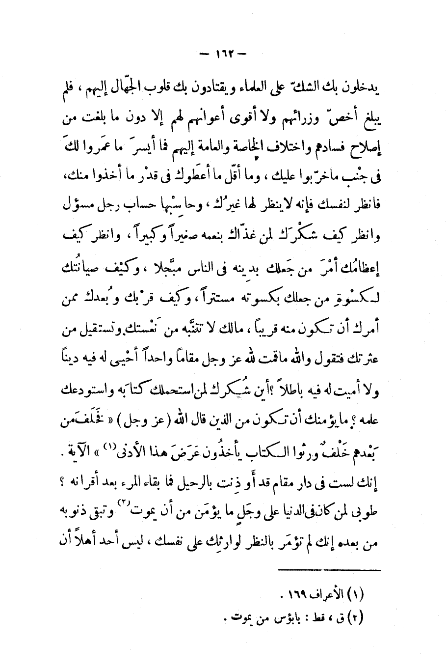 يدخلون بك الشك على العلماء ويقتادون بك قلوب الجهال إليهم فلم يبلغ أخص وزرائهم ولا أقوى أعوانهم لهم إلا دون ما بلغت من إصلاح فسادهم واختلاف الخاصة والعامة إليهم فما أيسر ما عمروا لك في جنب ما خربوا عليك وما أقل ما أعطوك في قدر ما أخذوا منك فانظر لنفسك فإنه لا ينظر لها غيرك وحاسبها حساب رجل مسؤل وانظر كيف شكرك لمن غذاك بنعمه صغيرا وكبيرا وانظر كيف إعظامك أمر من جعلك بدينه في الناس مبجلا وكيف صيانتك لكسوة من جعلك بكسوته مستترا وكيف قربك وبعدك ممن أمرك أن تكون منه قريبا مالك لا تتنبه من نعستك وتستقيل من عثرتك فتقول والله ما قمت لله عز و جل مقاما واحدا أحيى له فيه دينا ولا أميت له فيه باطلا أين شكرك لمن استحملك كتابه واستودعك علمه ما يؤمنك أن تكون من الذين قال الله عز و جل فخلف من بعدهم خلف ورثوا الكتاب يأخذون عرض هذا الأدنى الآية إنك لست في دار مقام قد أوذنت بالرحيل فما بقاء المرء بعد أقرانه طوبى لمن كان في الدنيا على وجل ما يؤمن من أن يموت وتبقى ذنوبه من بعده إنك لم تؤمر بالنظر لوارثك على نفسك ليس أحد أهلا أن