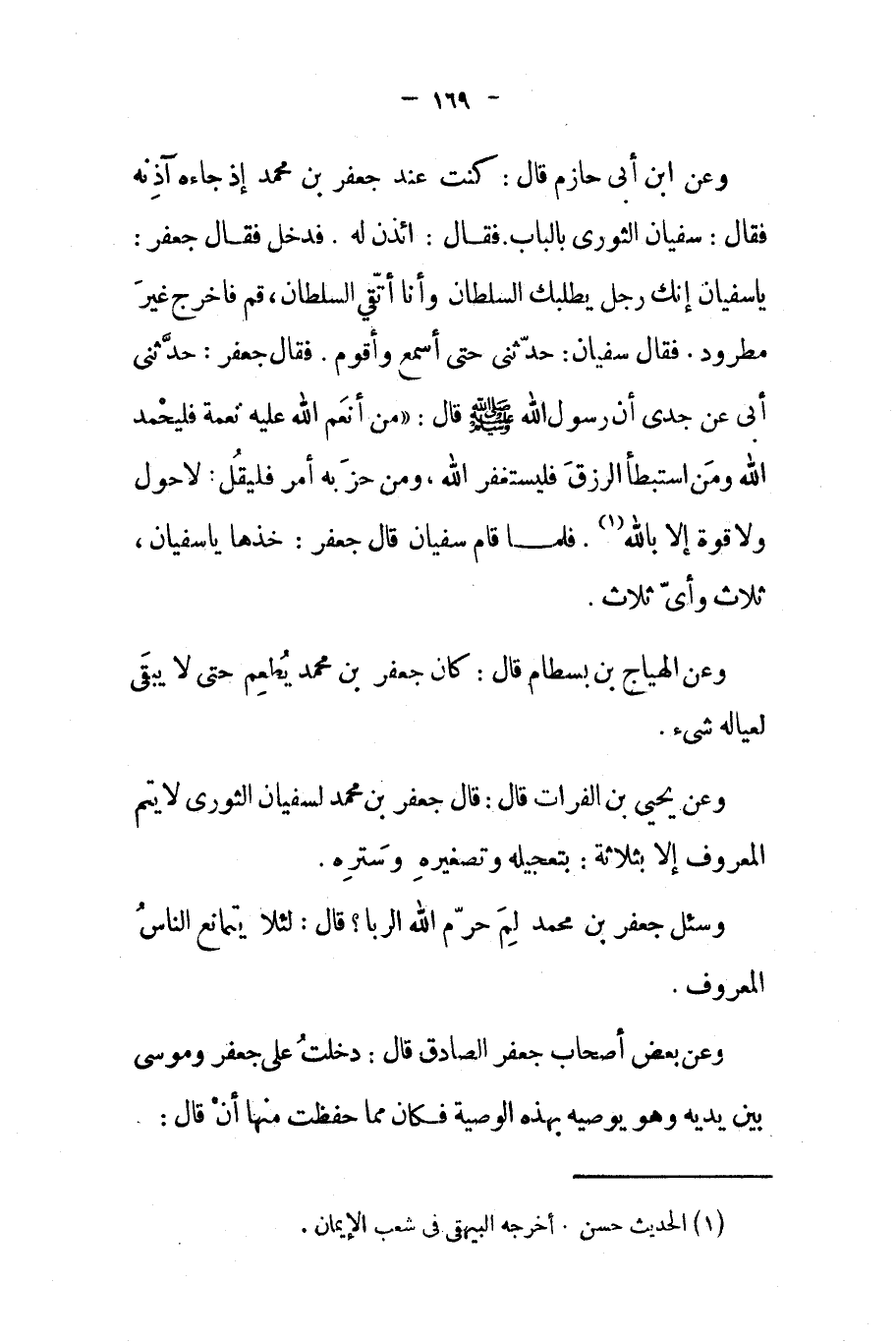 وعن إبن أبي حازم قال كنت عند جعفر بن محمد إذ جاءه آذنه فقال سفيان الثوري بالباب فقال ائذن له فدخل فقال جعفر يا سفيان إنك رجل يطلبك السلطان وأنا أتقي السلطان قم فاخرج غير مطرود فقال سفيان حدثني حتى أسمع وأقوم فقال جعفر حدثني أبي عن جدي أن رسول الله صلى الله عليه و سلم قال
