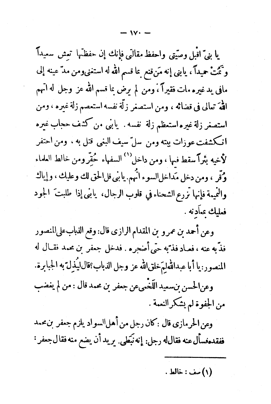 يا بني أقبل وصيتي واحفظ مقالتي فإنك إن حفظتها تعش سعيدا وتمت حميدا يا بني إنه من قنع بما قسم الله له استغنى ومن مد عينه إلى ما في يد غيره مات فقيرا ومن لم يرض بما قسم الله عز و جل له اتهم الله تعالى في قضائه ومن استصغر زلة نفسه استعصم زلة غيره ومن استصغر زلة غيره استعظم زلة نفسه يا بني من كشف حجاب غيره انكشفت عورات بيته ومن سل سيف البغى قتل به ومن احتفر لأخيه بئرا سقط فيها ومن داخل السفهاء حقر ومن خالط العلماء وقر ومن دخل مداخل السوء اتهم يا بني قل الحق لك وعليك وإياك والنميمة فإنها تزرع الشحناء في قلوب الرجال يا بني إذا طلبت الجود فعليك بمعادته
