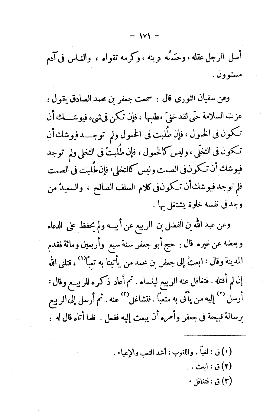 وعن سفيان الثوري قال سمعت جعفر بن محمد الصادق يقول عزت السلامة حتى لقد خفى مطلبها فإن تكن في شيء فيوشك أن تكون في الخمول فإن طلبت في الخمول ولم توجد فيوشك أن تكون في التخلى وليس كالخمول فإن طلبت في التخلي ولم توجد فيوشك أن تكون في الصمت وليس كالتخلي فإن طلبت في الصمت فلم توجد فيوشك أن تكون في كلام السلف الصالح والسعيد من وجد في نفسه خلوة يشتغل بها