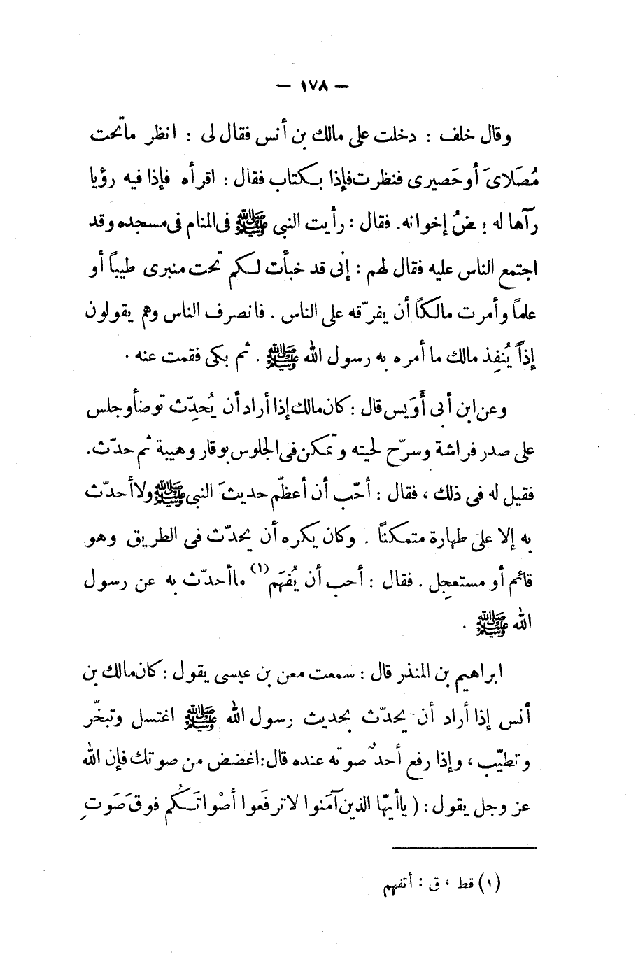 إبراهيم بن المنذر قال سمعت معن بن عيسى يقول كان مالك بن أنس إذا أراد أن يحدث بحديث رسول الله صلى الله عليه و سلم إغتسل وتبخر وتطيب وإذا رفع أحد صوته عنده قال أغضض من صوتك فإن الله عز و جل يقول يا أيها الذين آمنوا لاترفعوا أصواتكم فوق صوت