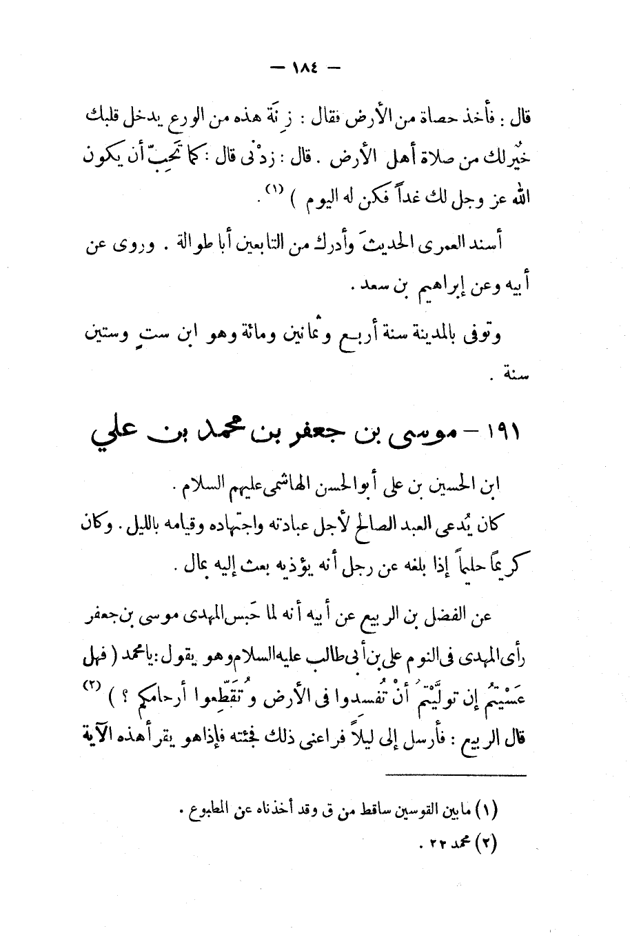 عن الفضل بن الربيع عن أبيه أنه لما حبس المهدي موسى بن جعفر رأى المهدي في النوم علي بن أبي طالب عليه السلام وهو يقول يا محمد فهل عسيتم إن توليتم أن تفسدوا في الأرض وتقطعوا أرحامكم قال الربيع فأرسل إلي ليلا فراعني ذلك فجئته فإذا هو يقرأ هذه الآية