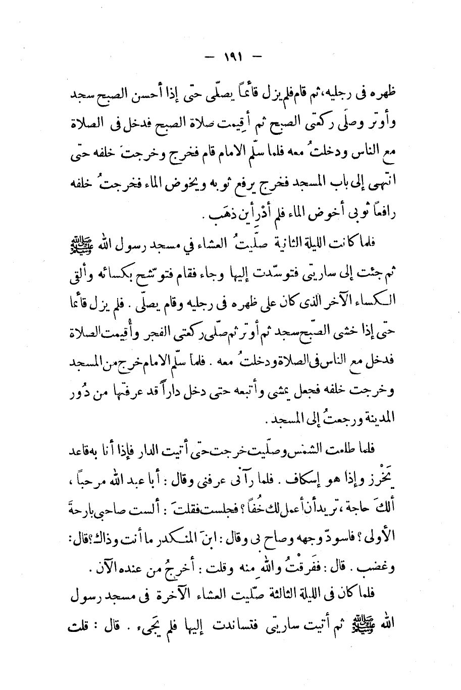 فلما كانت الليلة الثانية صليت العشاء في مسجد رسول الله صلى الله عليه و سلم ثم جئت إلى ساريتي فتوسدت إليها وجاء فقام فتوشح بكسائه وألقى الكساء الآخر الذي كان على ظهره في رجليه وقام يصلي فلم يزل قائما حتى إذا خشي الصبح سجد ثم أوتر ثم صلى ركعتي الفجر وأقيمت الصلاة فدخل مع الناس فيالصلاة ودخلت معه فلما سلم الإمام خرج من المسجد وخرجت خلفه فجعل يمشي وأتبعه حتى دخل دارا قد عرفتها من دور المدينة ورجعت إلى المسجد