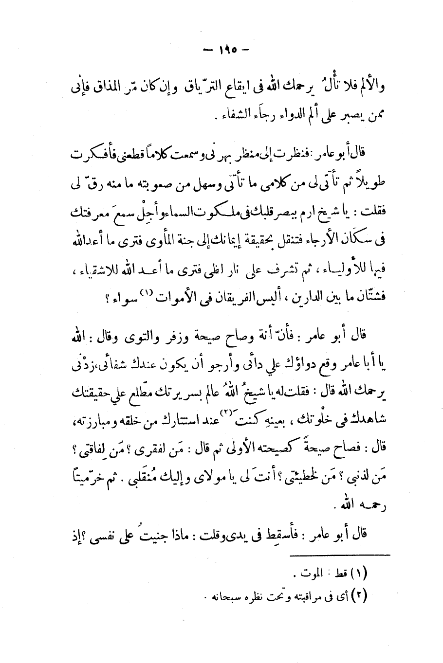 قال أبو عامر فنظرت إلى منظر بهرني وسمعت كلاما قطعني فأفكرت طويلا ثم تأتي لي من كلامي ما تأتى وسهل من صعوبته مامنه رق لي فقلت يا شيخ إرم ببصر قلبك في ملكوت السماء وأجل سمع معرفتك في سكان الأرجاء فتنقل بحقيقة إيمانك إلى جنة المأوى فترى ما أعد الله فيها للأولياء ثم تشرف على نار لظى فترى ما أعد الله للأشقياء فشتان ما بين الدارين أليس الفريقان في الأموات سواء