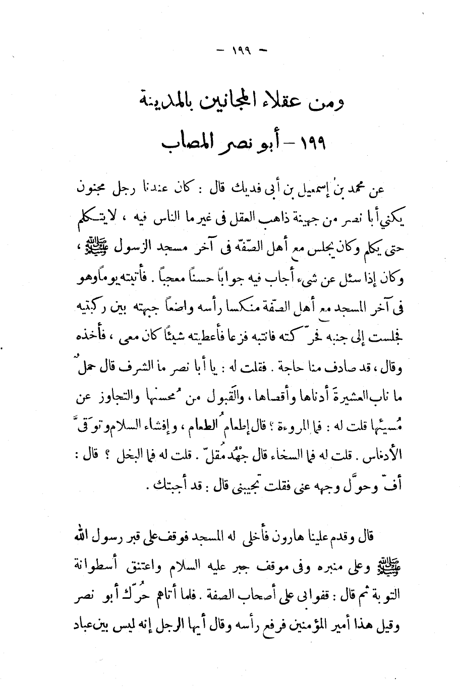 عن محمد بن إسمعيل بن أبي فديك قال كان عندنا رجل مجنون يكنى أبا نصر من جهينة ذاهب العقل في غير ما الناس فيه لايتكلم حتى يكلم وكان يجلس مع أهل الصفة في آخر مسجد الرسول صلى الله عليه و سلم وكان إذا سئل عن شيء أجاب فيه جوابا حسنا معجبا فأتيته يوما وهو في آخر المسجد مع أهل الصفة منكسا رأسه واضعا جبهته بين ركبتيه فجلست إلى جنبه فحركته فانتبه فزعا فأعطيته شيئا كان معي فأخذه وقال قد صادف منا حاجة فقلت له يا أبا نصر ما الشرف قال حمل ما ناب العشيرة أدناها وأقصاها والقبول من محسنها والتجاوز عن مسيئها قلت له فما المروءة قال إطعام الطعام وإفشاء السلام وتوقي الأدناس قلت له فما السخاء قال جهد مقل قلت له فما البخل قال أف وحول وجهه عني فقلت تجيبني قال قد أجبتك