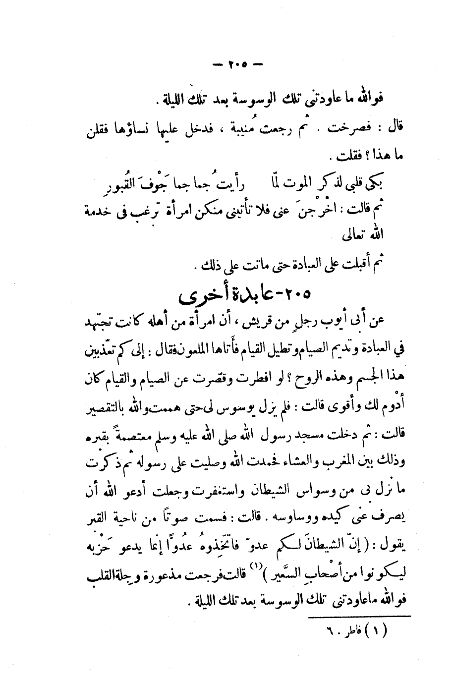 عن أبي أيوب رجل من قريش أن إمرأة من أهله كانت تجتهد في العبادة وتديم الصيام وتطيل القيام فأتاها الملعون فقال إلى كم تعذبين هذا الجسم وهذه الروح لو أفطرت وقصرت عن الصيام والقيام كان أدوم لك وأقوى قالت فلم يزل يوسوس لي حتى هممت والله بالتقصير قالت ثم دخلت مسجد رسول الله صلى الله عليه و سلم معتصمة بقبره وذلك بين المغرب والعشاء فحمدت الله وصليت على رسوله ثم ذكرت ما نزل بي من وسواس الشيطان وإستغفرت وجعلت أدعو الله أن يصرف عني كيده ووساوسه قالت فسمت صوتا من ناحية القبر يقول إن الشيطان لكم عدو فاتخذوه عدوا إنما يدعو حزبه ليكونوا من أصحاب السعير قالت فرجعت مذعورة وجلة القلب فوالله ماعاودتني تلك الوسوسة بعد تلك الليلة