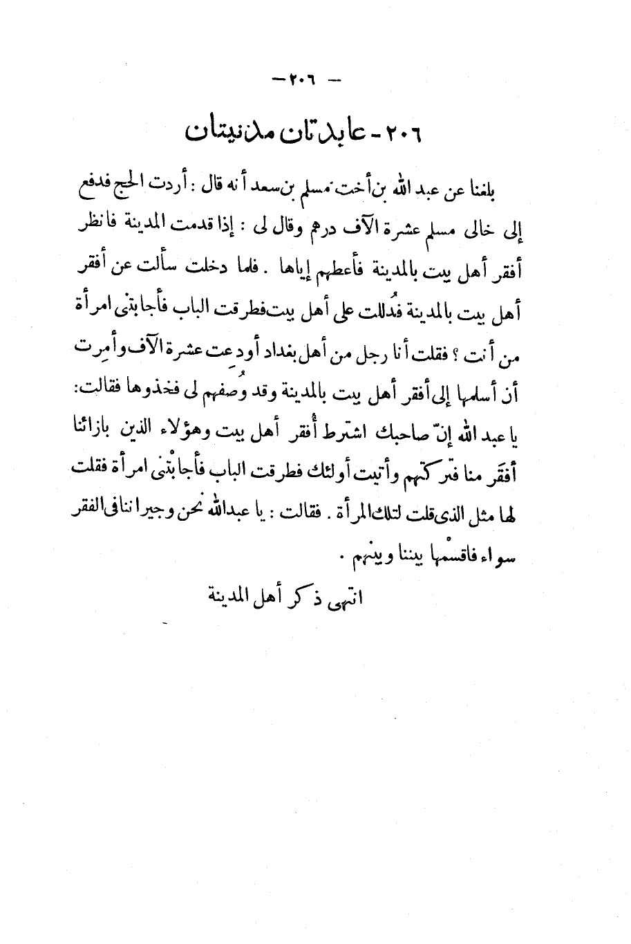 بلغنا عن عبد الله بن أخت مسلم بن سعد أنه قال أردت الحج فدفع إلى خالي مسلم عشرة آلاف درهم وقال لي إذا قدمت المدينة فانظر أفقر أهل بيت بالمدينة فأعطهم إياها فلما دخلت سألت عن أفقر أهل بيت بالمدينة فدللت على أهل بيت فطرقت الباب فأجابتني امرأة من أنت فقلت أنا رجل من أهل بغداد أودعت عشرة آلاف وأمرت أن أسلمها إلى أفقر أهل بيت بالمدينة وقد وصفهم لي فخذوها فقالت يا عبد الله إن صاحبك اشترط أفقر أهل بيت وهؤلاء الذين بازائنا أفقر منا فتركتهم وأتيت أولئك فطرقت الباب فأجابتني امرأة فقلت لها مثل الذي قلت لتلك المرأة فقالت يا عبد الله نحن وجيراننا في الفقر سواء فاقسمها بيننا وبينهم