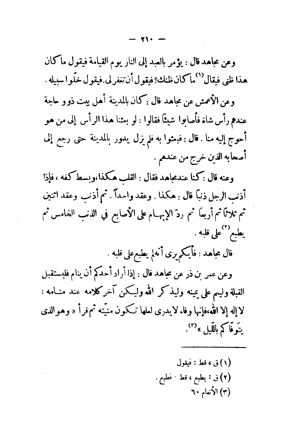 وعنه قال كنا عند مجاهد فقال القلب هكذا وبسط كفه فإذا أذنب الرجل ذنبا قال هكذا وعقد واحدا ثم أذنب وعقد اثنين ثم ثلاثا ثم أربعا ثم رد الإبهام على الأصابع في الذنب الخامس ثم يطبع على قلبه