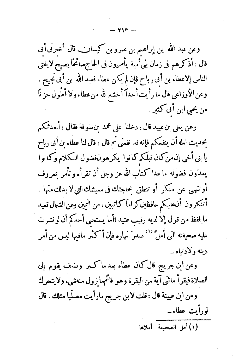 وعن يعلى بن عبيد قال دخلنا على محمد بن سوقة فقال أحدثكم بحديث لعله أن ينفعكم فإنه قد نفعني ثم قال قال لنا عطاء بن أبي رباح يا بني أخي إن من كان قبلكم كانوا يكرهون فضول الكلام وكانوا يعدون فضوله ما عدا كتاب الله عز و جل أن تقرأه وتأمر بمعروف أو تنهى عن منكر أو تنطق بحاجتك في معيشك التي لا بدلك منها أتنكرون أن عليكم حافظين كراما كاتبين عن اليمين وعن الشمال قعيد ما يلفظ من قول إلا لديه رقيب عتيد أما يستحيى أحدكم أن لو نشرت عليه صحيفته التي أمل صدر نهاره فإن أكثر ما فيها ليس من أمر دينه ولا دنياه