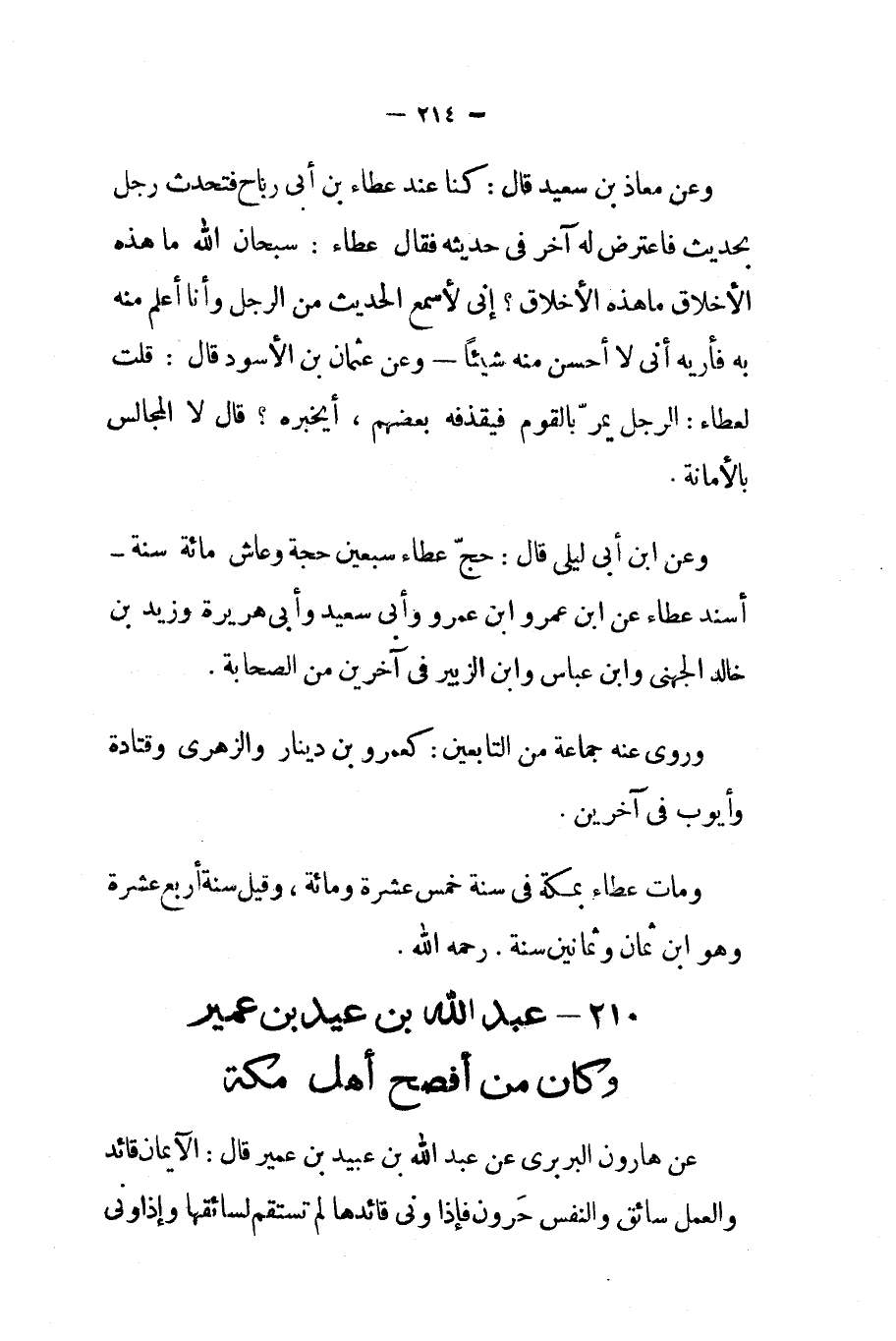 وعن إبن أبي ليلى قال حج عطاء سبعين حجة وعاش مائة سنة أسند عطاء عن إبن عمرو إبن عمرو وأبي سعيد وأبي هريرة وزيد بن خالد الجهني وإبن عباس وإبن الزبير في آخرين من الصحابة