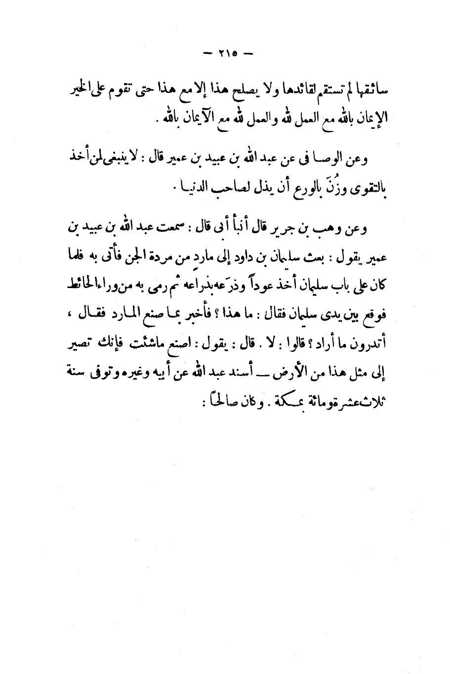 وعن وهب بن جرير قال أنبأ أبي قال سمعت عبد الله بن عبيد بن عمير يقول بعث سليمان بن داود إلى مارد من مردة الجن فأتي به فلما كان على باب سليمان أخذ عودا وذرعه بذراعه ثم رمى به من وراء الحائط فوقع بين يدي سليمان فقال ما هذا فأخبر بما صنع المارد فقال أتدرون ما أراد قالوا لا قال يقول أصنع ما شئت فإنك تصير إلى مثل هذا من الأرض أسند عبد الله عن أبيه وغيره وتوفي سنة ثلاث عشرة ومائة بمكة وكان صالحا