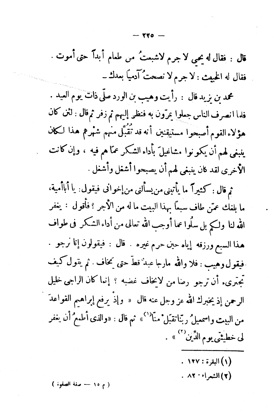 ثم قال كثيرا ما يأتيني من يسألني من إخواني فيقول يا أبا أمية ما بلغك عمن طاف سبعا بهذا البيت ما له من الأجر فأقول يغفر الله لنا ولكم بل سلوا عما أوجب الله تعالى من أداء الشكر في طواف هذا السبع ورزقه إياه حين حرم غيره قال فيقولون إنا نرجو