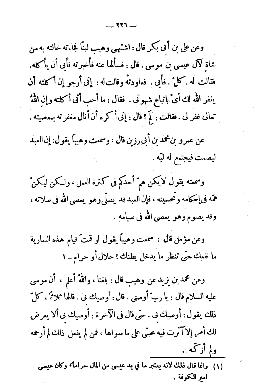 وعن علي بن أبي بكر قال اشتهى وهيب لبنا فجاءته خالته به من شاة لآل عيسى بن موسى قال فسألها عنه فأخبرته فأبى أن يأكله فقالت له كل فأبى فعاودته وقالت له إني أرجو إن أكلته أن يغفر الله لك أي باتباع شهوتي فقال ما أحب أني أكلته وإن الله تعالى غفر لي فقالت لم قال إني أكره أن أنال مغفرته بمعصيته