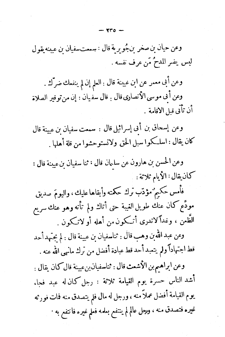 وعن إبراهيم بن الأشعث قال ثنا سفيان بن عيينة قال كان يقال أشد الناس حسرة يوم القيامة ثلاثة رجل كان له عبد فجاء يوم القيامة أفضل عملا منه ورجل له مال فلم يتصدق منه فمات فورثه غيره فتصدق منه ورجل عالم لم ينتفع بعلمه فعلم غيره فانتفع به