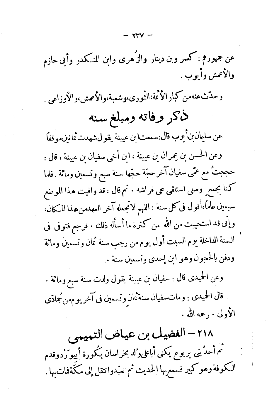 وعن الحسن بن عمران بن عيينة إبن أخي سفيان بن عيينة قال حججت مع عمي سفيان آخر حجة حجها سنة سبع وتسعين ومائة فلما كنا بجمع وصلى استلقى على فراشه ثم قال قد وافيت هذا الموضع سبعين عاما أقول في كل سنة اللهم لا تجعله آخر العهد من هذا المكان وإني قد استحييت من الله من كثرة ما أسأله ذلك فرجع فتوفي في السنة الداخلة يوم السبت أول يوم من رجب سنة ثمان وتسعين ومائة ودفن بالحجون وهو إبن إحدى وتسعين سنة