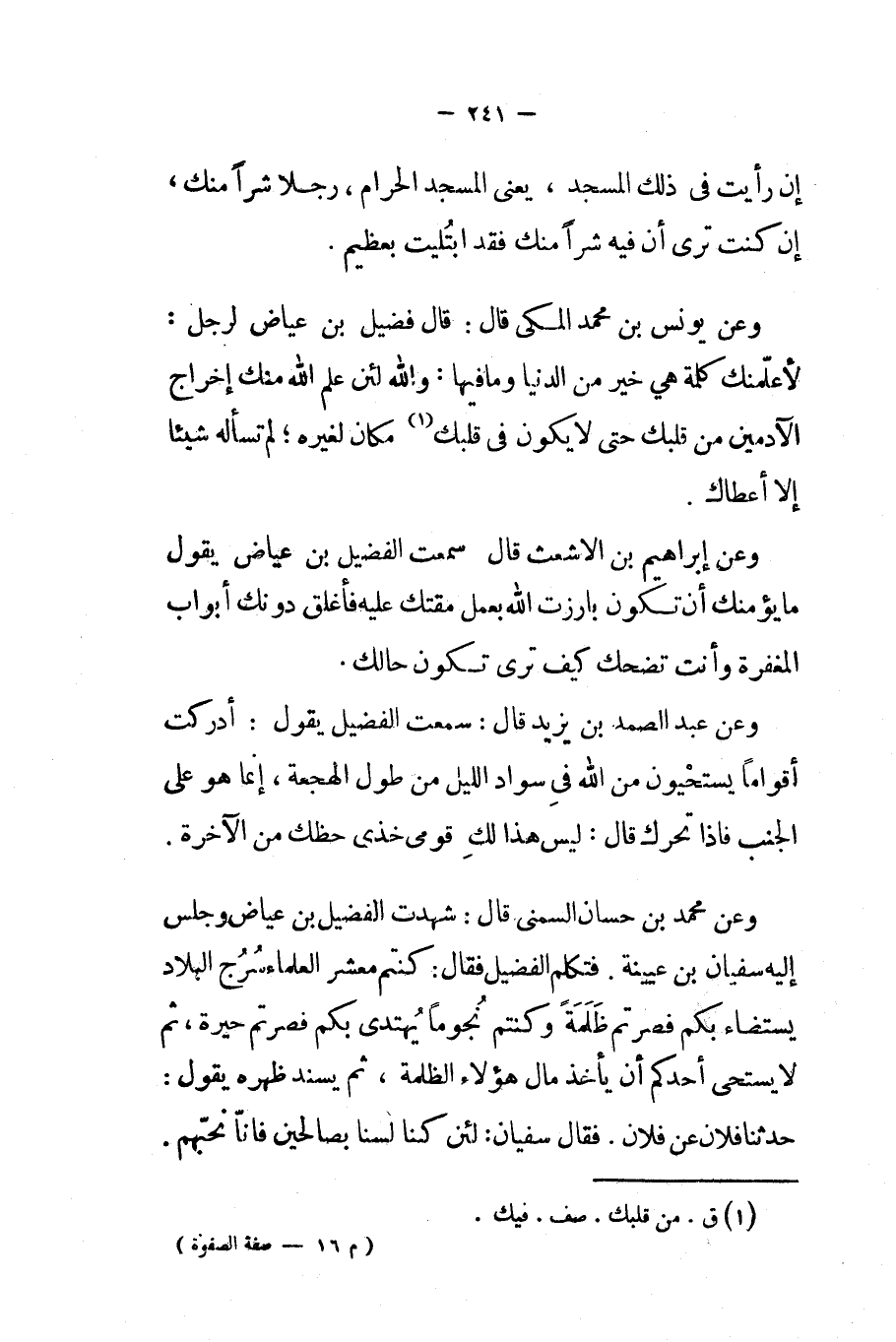 وعن محمد بن حسان السمني قال شهدت الفضيل بن عياض وجلس إليه سفيان بن عيينة فتكلم الفضيل فقال كنتم معشر العلماء سرج البلاد يستضاء بكم فصرتم ظلمة وكنتم نجوما يهتدى بكم فصرتم حيرة ثم لايستحي أحدكم أن يأخذ مال هؤلاء الظلمة ثم يسند ظهره يقول حدثنا فلان عن فلان فقال سفيان لئن كنا لسنا بصالحين فإنا نحبهم
