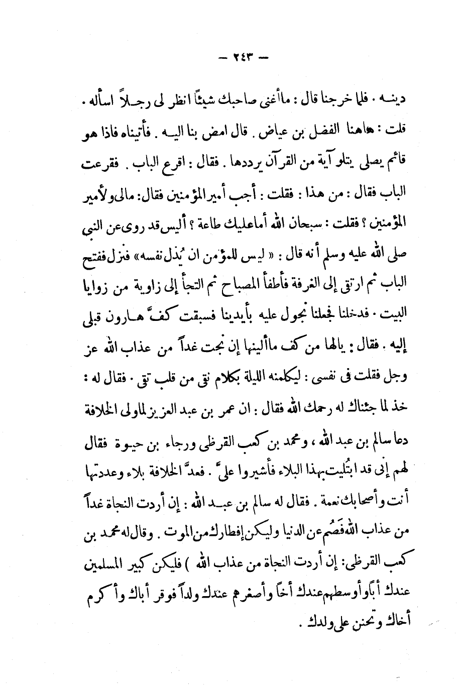 ليس للمؤمن أن يذل نفسه فنزل ففتح الباب ثم إرتقى إلى الغرفة فأطفأ المصباح ثم التجأ إلى زاوية من زوايا البيت فدخلنا فجعلنا نجول عليه بأيدينا فسبقت كف هارون قبلي إليه فقال يا لها من كف ما ألينها إن نجت غدا من عذاب الله عز و جل فقلت في نفسي ليكلمنه الليلة بكلام نقي من قلب تقي فقال له خذ لما جئناك له رحمك الله فقال إن عمر بن عبد العزيز لما ولي الخلافة دعا سالم بن عبد الله ومحمد بن كعب القرظي ورجاء بن حيوة فقال لهم إني قد ابتليت بهذا البلاء فأشيروا علي فعد الخلافة بلاء وعددتها أنت وأصحابك نعمة فقال له سالم بن عبد الله إن أردت النجاة غدا من عذاب الله فصم عن الدنيا وليكن إفطارك من الموت وقال له محمد بن كعب القرظي إن أردت النجاة من عذاب الله فليكن كبير المسلمين عندك أبا وأوسطهم عندك أخا وأصغرهم عندك ولدا فوقر أباك وأكرم أخاك وتحنن على ولدك