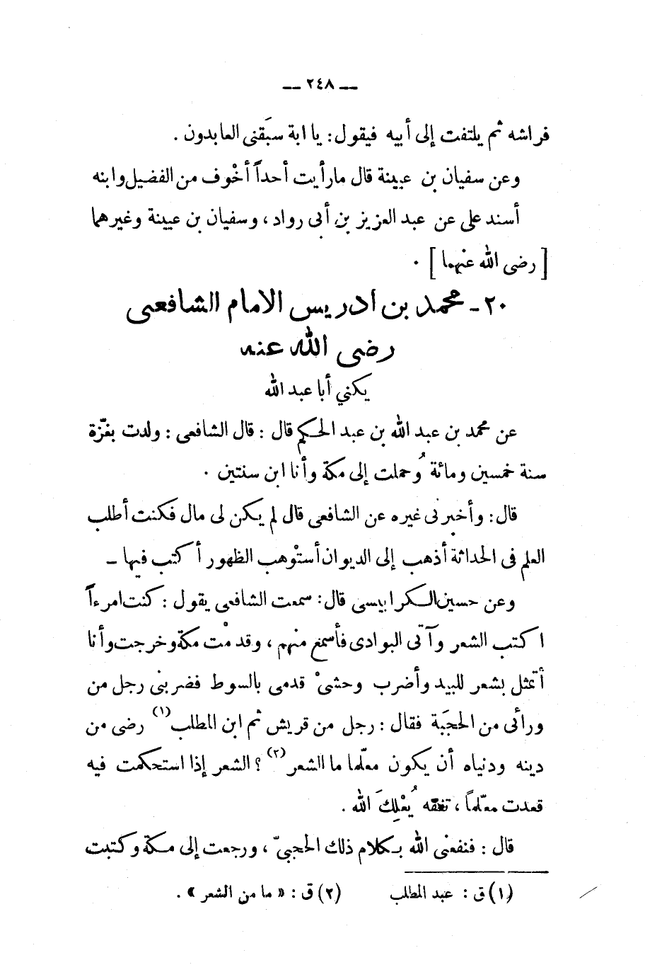 وعن حسين الكرابيسي قال سمعت الشافعي يقول كنت إمرءا أكتب الشعر وآتي البوادي فأسمع منهم وقدمت مكة وخرجت وأنا أتمثل بشعر للبيد وأضرب وحشي قدمي بالسوط فضربني رجل من ورائي من الحجبة فقال رجل من قريش ثم إبن المطلب رضي من دينه ودنياه أن يكون معلما مالشعر الشعر إذا استحكمت فيه قعدت معلما تفقه يعلك الله