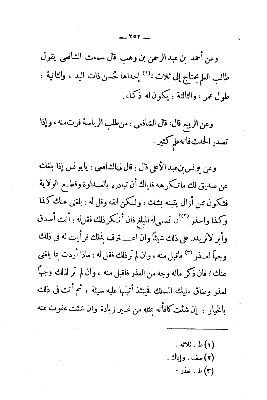 وعن أحمد بن عبد الرحمن بن وهب قال سمعت الشافعي يقول طالب العلم يحتاج إلى ثلاث إحداها حسن ذات اليد والثانية طول عمر والثالثة يكون له ذكاء