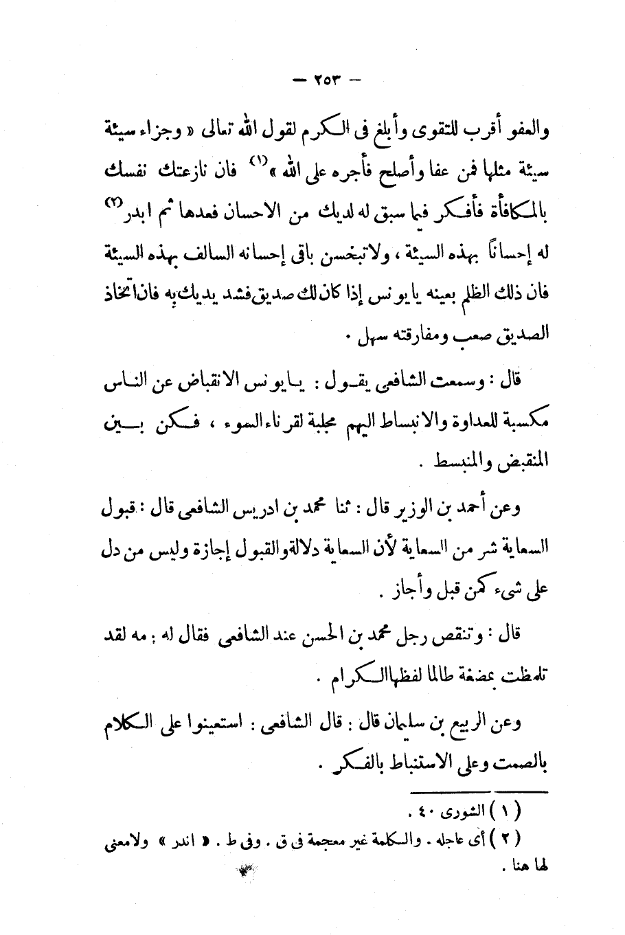 وعن الربيع بن سليمان قال قال الشافعي إستعينوا على الكلام بالصمت وعلى الإستنباط بالفكر