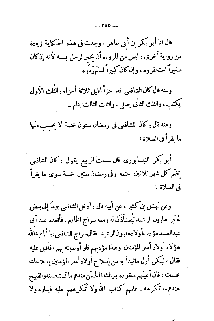 وعن نهشل بن كثير عن أبيه قال أدخل الشافعي يوما إلى بعض حجر هارون الرشيد ليستأذن له ومعه سراج الخادم فأقعده عند أبي عبد الصمد مؤدب أولاد هارون الرشيد فقال سراج للشافعي يا أبا عبد الله هؤلاء أولاد أمير المؤمنين وهذا مؤدبهم فلو أوصيته بهم فأقبل عليه فقال ليكن أول ما تبدأ به من إصلاح أولاد أمير المؤمنين إصلاحك نفسك فإن أعينهم معقودة بعينك فالحسن عندهم ماتستحسنه والقبيح عندهم ما تكرهه علمهم كتاب الله ولاتكرههم عليه فيملوه ولا
