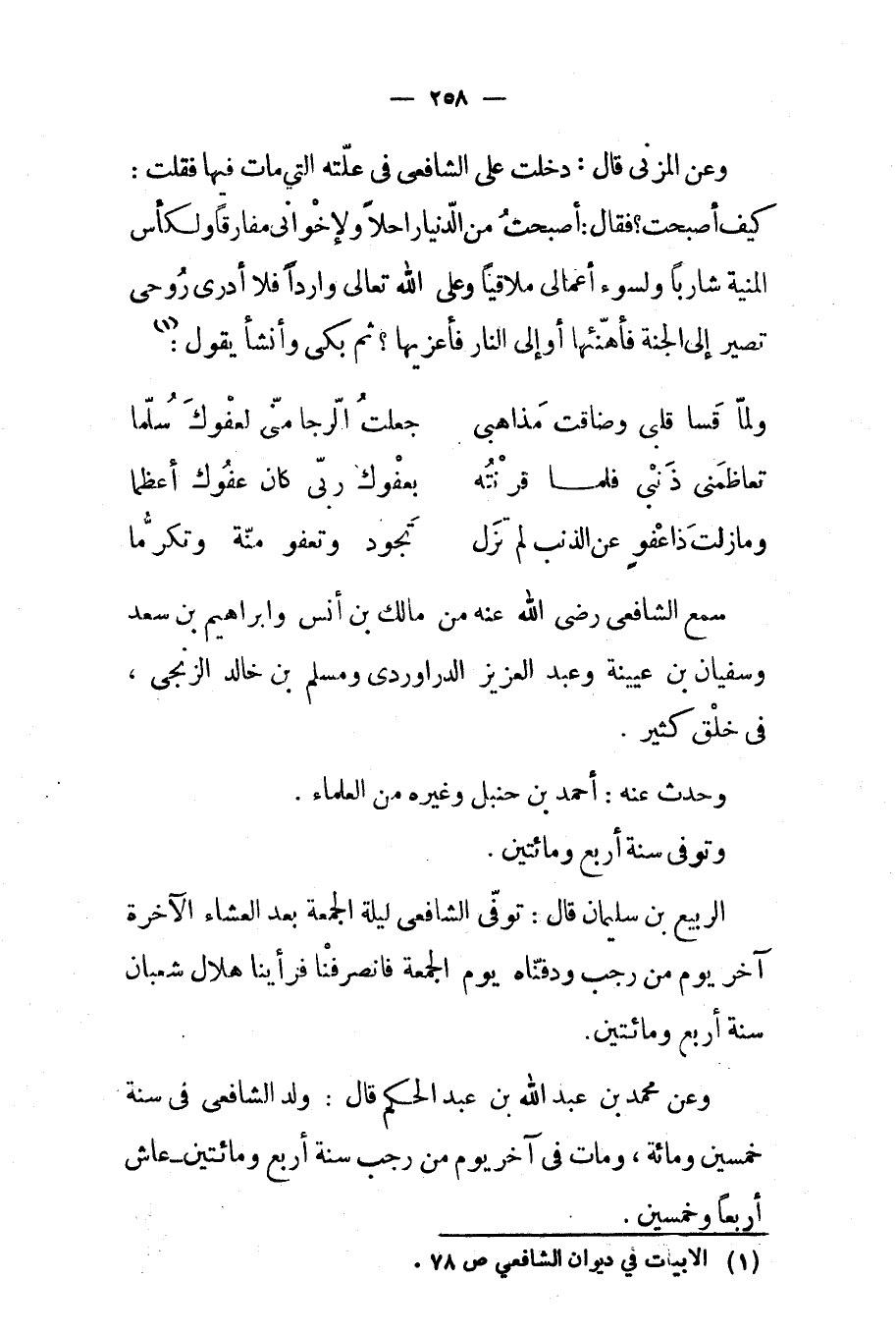 الربيع بن سليمان قال توفي الشافعي ليلة الجمعة بعد العشاء الآخرة آخر يوم من رجب ودفناه يوم الجمعة فانصرفنا فرأينا هلال شعبان سنة أربع ومائتين