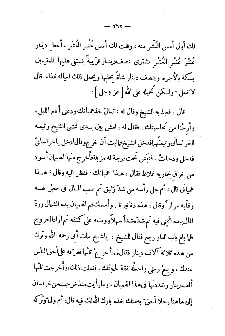 قال فجذبه الشيخ وقال له تعال خذ هميانك ودعني أنام الليل وأرحنا من محاسبتك فقال له امش بين يدي فمشى الشيخ وتبعه الخراساني وتبعتهما فدخل الشيخ فما لبث أن خرج وقال ادخل يا خراساني فدخل ودخلت فنبش تحت درجة له مزبلة فأخرج من الهيمان أسود من خرق بخارية غلاظ فقال هذا هميانك فنظر إليه وقال هذا همياني قال ثم حل رأسه من شد وثيق ثم صب المال في حجر نفسه وقلبه مرارا وقال هذه دنانيرنا وأمسك فم الهميان بيده الشمال ورد المال بيده اليمنى فيه ثم شده شدا سهلا ووضعه على كتفه ثم أراد الخروج فلما بلغ باب الدار رجع فقال للشيخ يا شيخ مات أبي رحمه الله وترك من هذه ثلاثة آلاف دينار فقال لي أخرج ثلثها ففرقه على أحق الناس عندك وبع رحلي وأجعله نفقة لحجتك ففعلت ذلك وأخرجت ثلثها ألف دينار وشددتها في هذا الهميان وما رأيت منذ خرجت من خراسان إلى ها هنا رجلا أحق به منك خذه بارك الله لك فيه قال ثم ولى وتركه