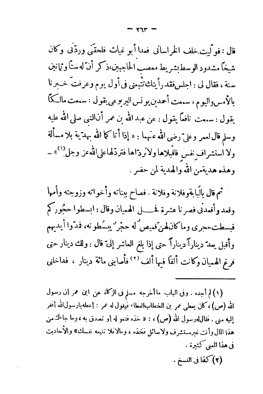 قال فوليت خلف الخراساني فعدا أبو غياث فلحقني وردني وكان شيخا مشدود الوسط بشريط معصب الحاجبين ذكر أن له ستا وثمانين سنة فقال لي إجلس فقد رأيتك تتبعني في أول يوم وعرفت خبرنا بالأمس واليوم سمعت أحمد بن يونس اليربوعي يقول سمعت مالكا يقول سمعت نافعا يقول عن عبد الله بن عمر أن النبي صلى الله عليه و سلم قال لعمر وعلي رضي الله عنهما