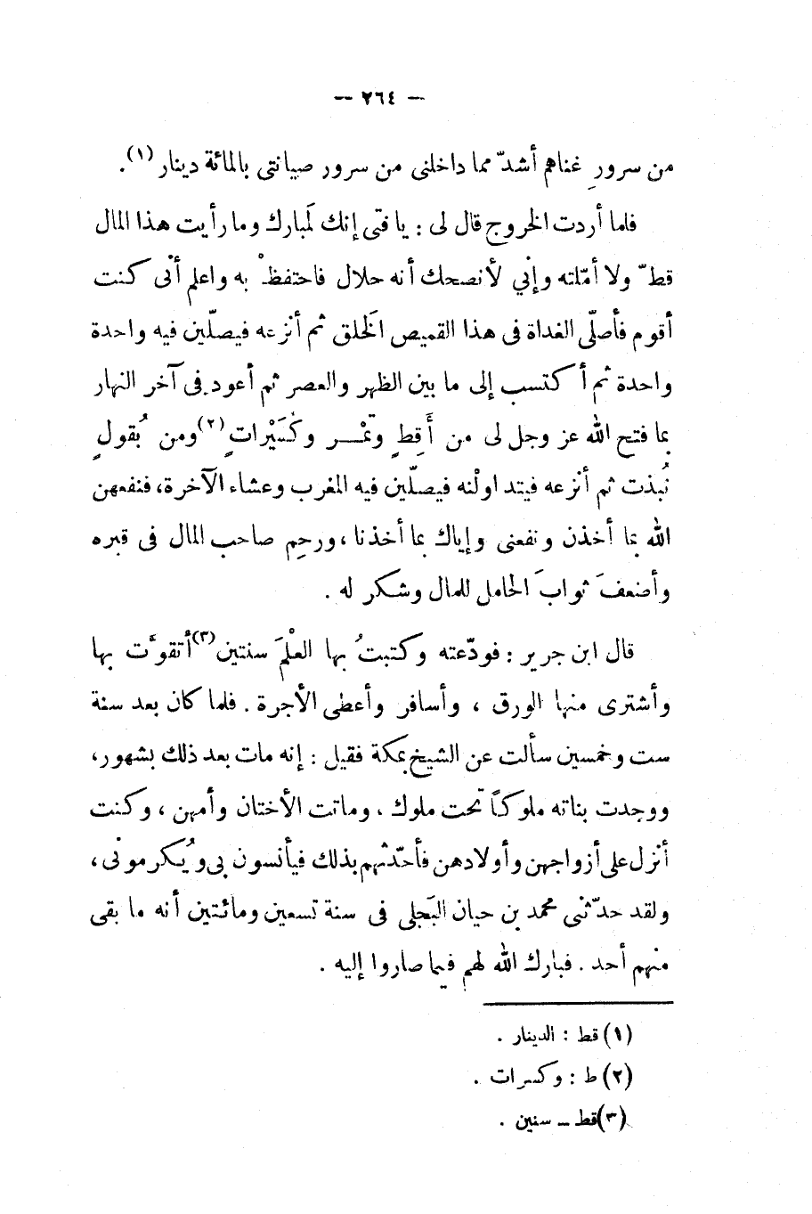 فلما أردت الخروج قال لي يا فتى إنك لمبارك وما رأيت هذا المال قط ولا أملته وإني لأنصحك أنه حلال فاحتفظ به وأعلم أني كنت أقوم فأصلي الغداة في هذا القميص الخلق ثم أنزعه فيصلين فيه واحدة واحدة ثم اكتسب إلى ما بين الظهر والعصر ثم أعود في آخر النهار بما فتح الله عز و جل لي من أقط وتمر وكسيرات ومن بقول نبذت ثم أنزعه فيتداولنه فيصلين فيه المغرب وعشاء الآخرة فنفعهن الله بما أخذن ونفعني وإياك بما أخذنا ورحم صاحب المال في قبره وأضعف ثواب الحامل للمال وشكر له