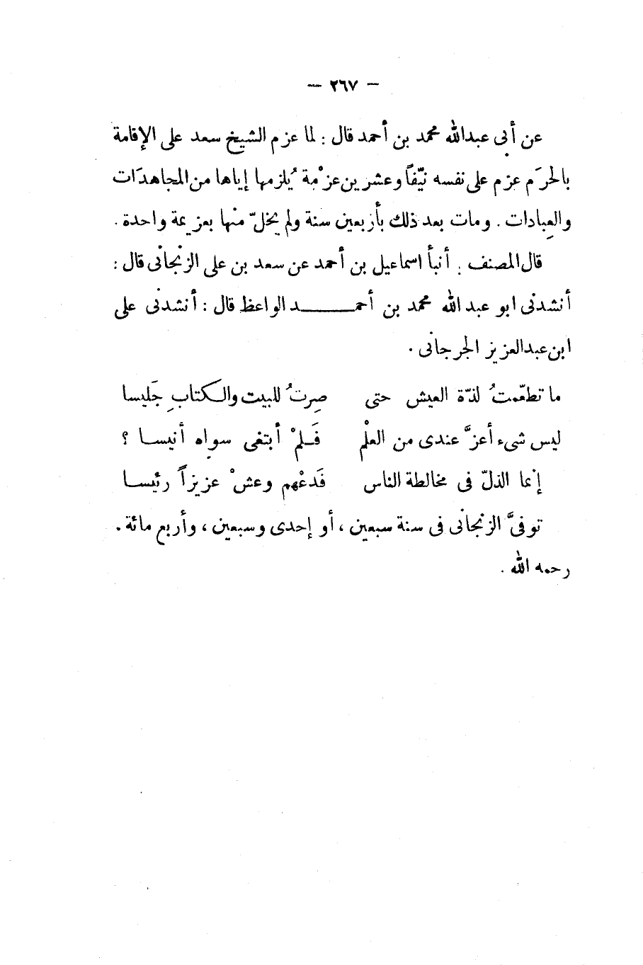 قال المصنف أنبأ إسماعيل بن أحمد عن سعد بن علي الزنجاني قال أنشدني أبو عبد الله محمد بن أحمد الواعظ قال أنشدني علي إبن عبد العزيز الجرجاني