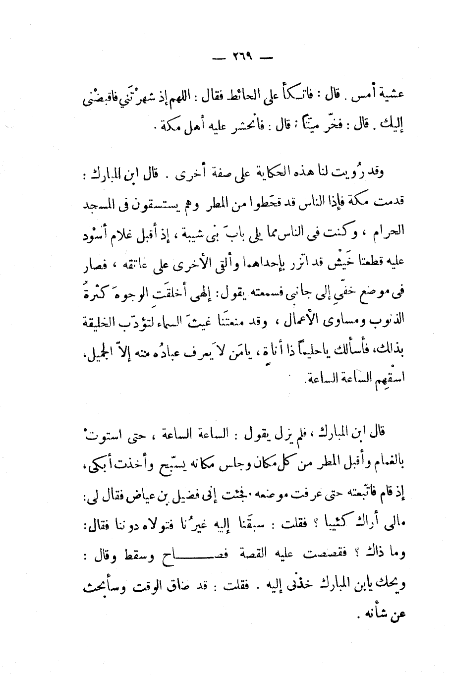 قال إبن المبارك فلم يزل يقول الساعة الساعة حتى استوت بالغمام وأقبل المطر من كل مكان وجلس مكانه يسبح وأخذت أبكي إذ قام فإتبعته حتى عرفت موضعه فجئت أبي فضيل بن عياض فقال لي مالي أراك كئيبا فقلت سبقنا إليه غيرنا فتولاه دوننا فقال وما ذاك فقصصت عليه القصة فصاح وسقط وقال ويحك يا بن المبارك خذني إليه فقلت قد ضاق الوقت وسأبحث عن شأنه