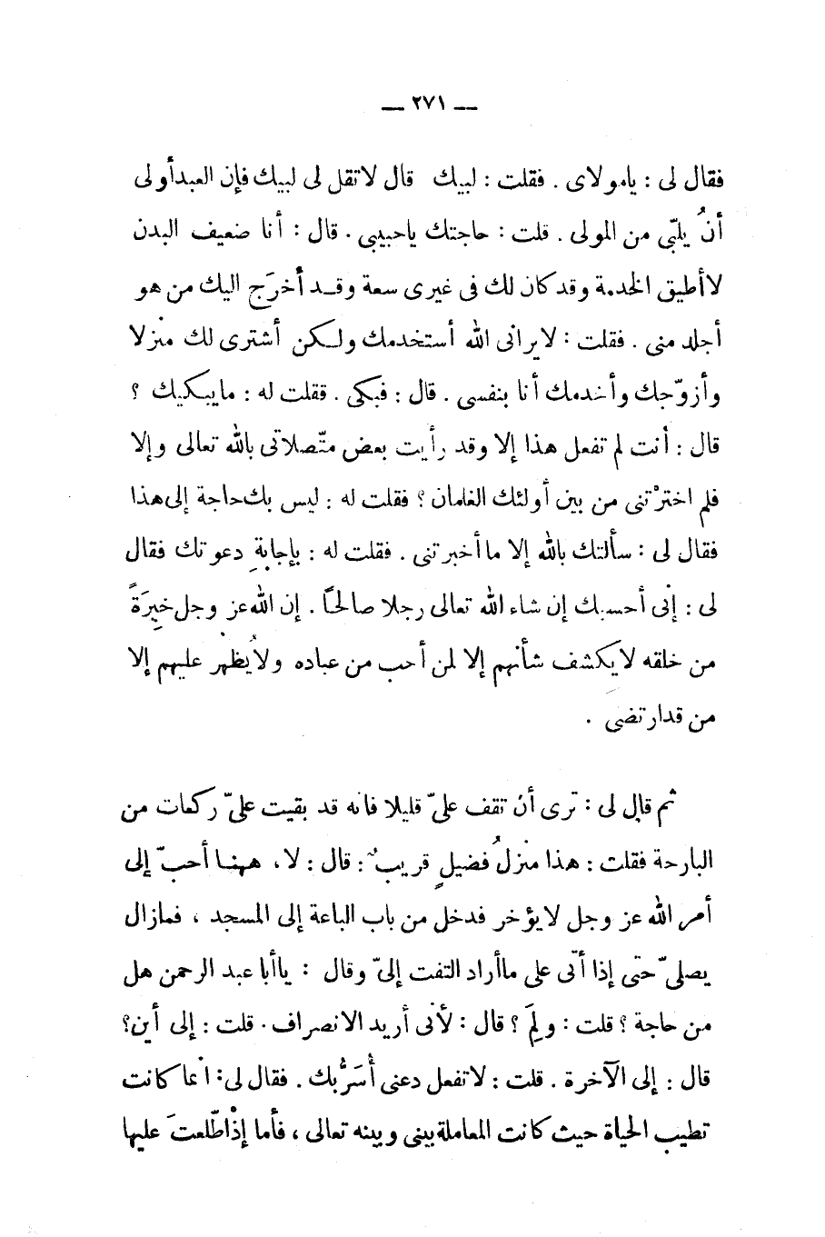 ثم قال لي ترى أن تقف علي قليلا فإنه قد بقيت على ركعات من البارحة فقلت هذا منزل فضيل قريب قال لا ههنا أحب إلى أمر الله عز و جل لا يؤخر فدخل من باب الباعة إلى المسجد فما زال يصلي حتى إذا أتى على ما أراد التفت إلي وقال يا أبا عبد الرحمن هل من حاجة قلت ولم قال لأني أريد الانصراف قلت إلى أين قال إلى الآخرة قلت لا تفعل دعني أسر بك فقال لي إنما كانت تطيب الحياة حيث كانت المعاملة بيني وبينه تعالى فأما إذ اطلعت عليها