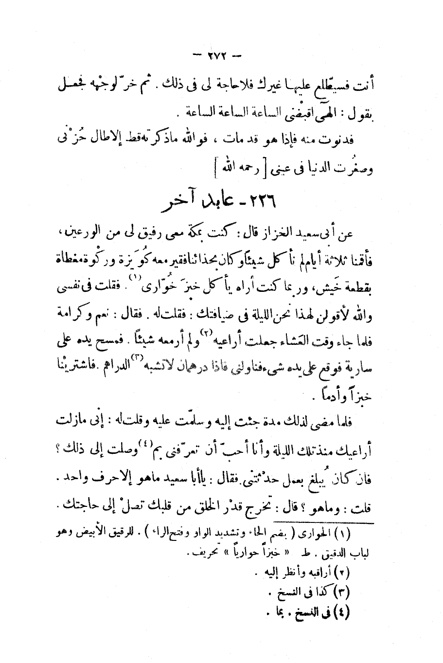 عن أبي سعيد الخزاز قال كنت بمكة معي رفيق لي من الورعين فأقمنا ثلاثة أيام لم نأكل شيئا وكان بحذائنا فقير معه كويزة وركوة مغطاة بقطعة خيش وربما كنت أراه يأكل خبز خوارى فقلت في نفسي والله لأقولن لهذا نحن الليلة في ضيافتك فقلت له فقال نعم وكرامة فلما جاء وقت العشاء جعلت أراعيه ولم أر معه شيئا فمسح يده على سارية فوقع على يده شيء فناولني فإذا درهمان لا تشبه الدراهم فاشترينا خبزا وأدما