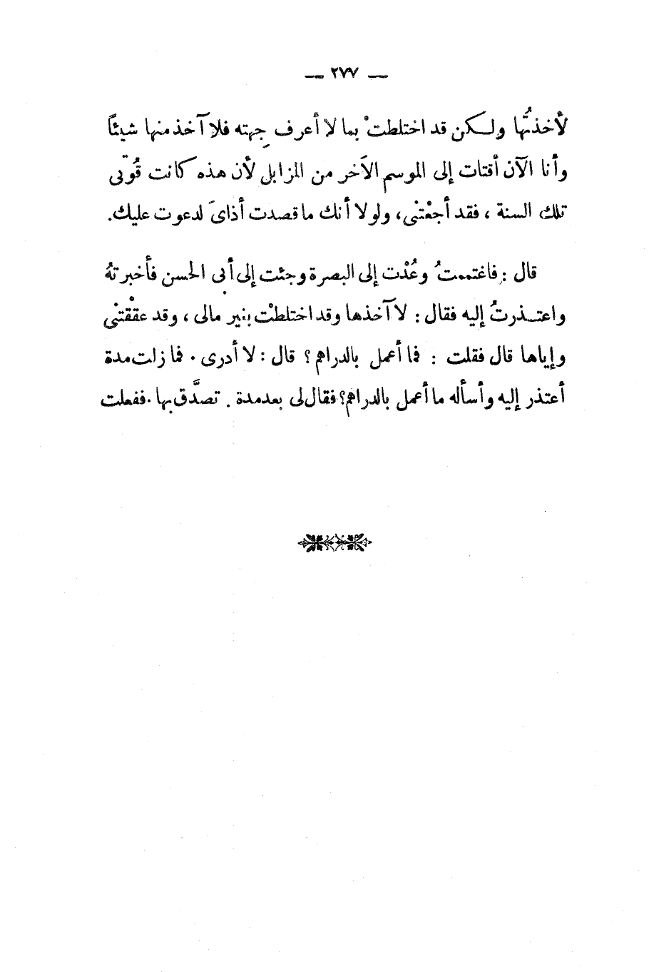 قال فاغتممت وعدت إلى البصرة وجئت إلى أبي الحسن فأخبرته واعتذرت إليه فقال لا آخذها وقد اختلطت بغير مالي وقد عققتني وإياها قال فقلت فما أعمل بالدراهم قال لا أدري فما زلت مدة أعتذر إليه وأسأله ما أعمل بالدراهم فقال لي بعد مدة تصدق بها ففعلت