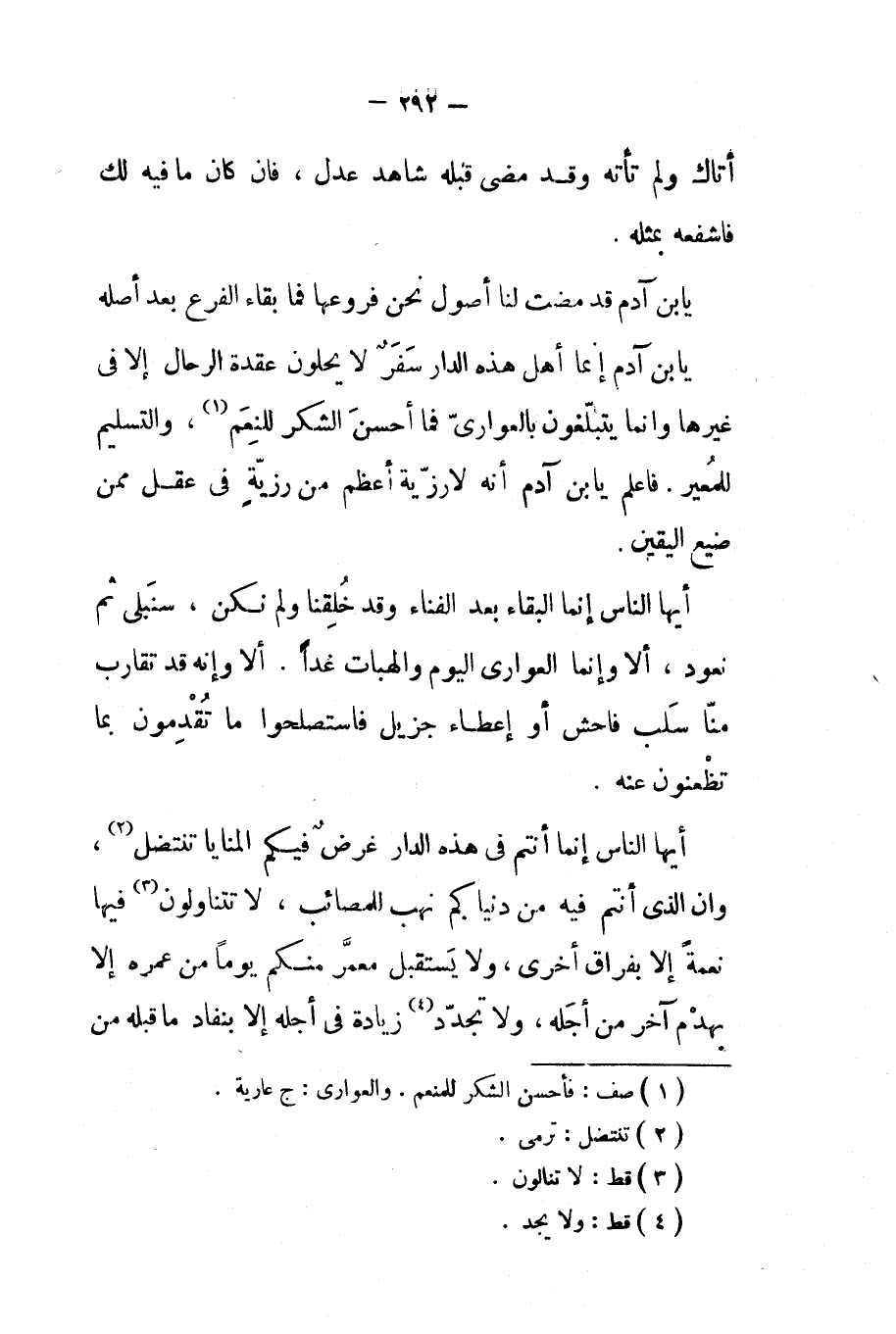 يا بن آدم إنما أهل هذه الدار سفر لايحلون عقدة الرحال إلا في غيرها وإنما يتبلغون بالعواري فما أحسن الشكر للنعم والتسليم للمعير فاعلم يابن آدم أنه لارزية أعظم من رزية في عقل ممن ضيع اليقين