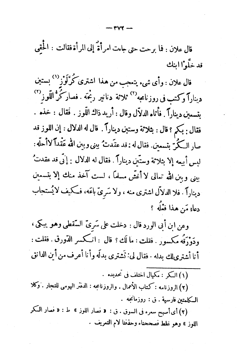 قال علان وأي شيء يتعجب من هذا اشترى كرلوز بستين دينارا وكتب في روزنامجة ثلاثة دنانير ربحه فصار كراللوز بتسعين دينارا فأتاه الدلال وقال أريد ذاك اللوز فقال خذ فقال بكم قال بثلاثة وستين دينارا قال له الدلال إن اللوز قد صار الكر بتسعين فقال له قد عقدت بيني وبين الله عقدا لا أحله ليس أبيعه إلا بثلاثة وستين دينارا فقال له الدلال إني قد عقدت بيني وبين الله تعالى لا أغش مسلما لست أخذ منك إلا بتسعين دينارا فلا الدلال اشترى منه ولا سري باعه فكيف لا يستجاب دعاء من هذا فعله