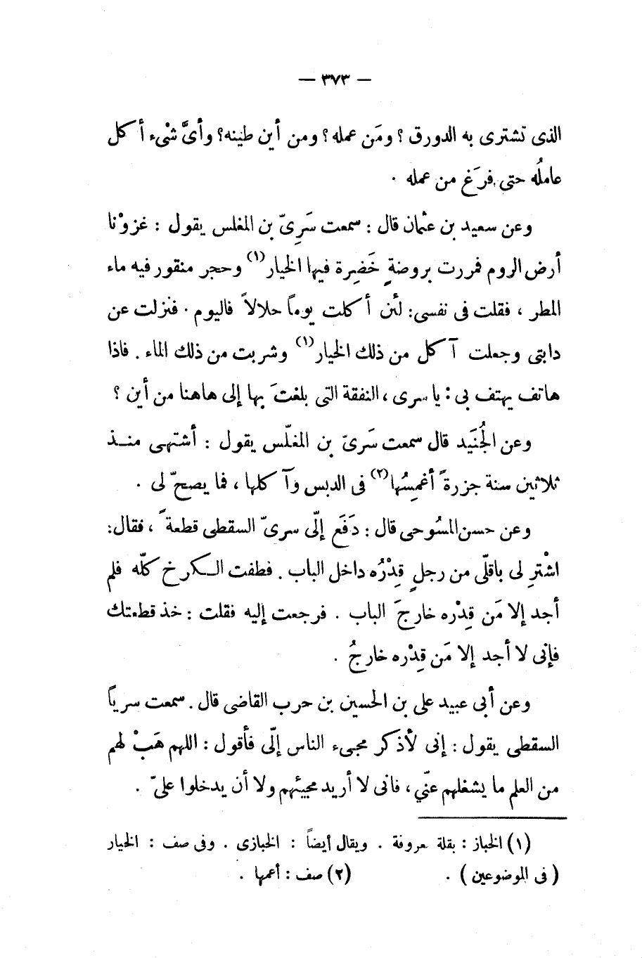 وعن سعيد بن عثمان قال سمعت سري بن المغلس يقول غزونا أرض الروم فمررت بروضة خضرة فيها الخيار وحجر منقور فيه ماء المطر فقلت في نفسي لأن أكلت يوما حلالا فاليوم فنزلت عن دابتي وجعلت آكل من ذلك الخيار وشربت من ذلك الماء فإذا هاتف يهتف بي يا سري النفقة التي بلغت بها إلى ها هنا من أين